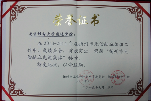 在扬州市卫生和计划生育委员会、扬州市红十字会组织的2013-2014年度“扬州市无偿献血先进集体”的评选中,威廉希尔官网积极组织,成绩显著,荣获“扬州市无偿献血先进集体”称号。