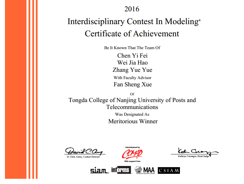 2016年美国大学生数学建模竞赛(MCM/ICM)近日揭晓,williamhill官方网站英国威廉希尔公司在竞赛中勇创佳绩,荣获美国大学生数学建模竞赛一等奖(Meritorious Winners)1项,成功参赛奖(Successful Participant)2项,再创历史新高。