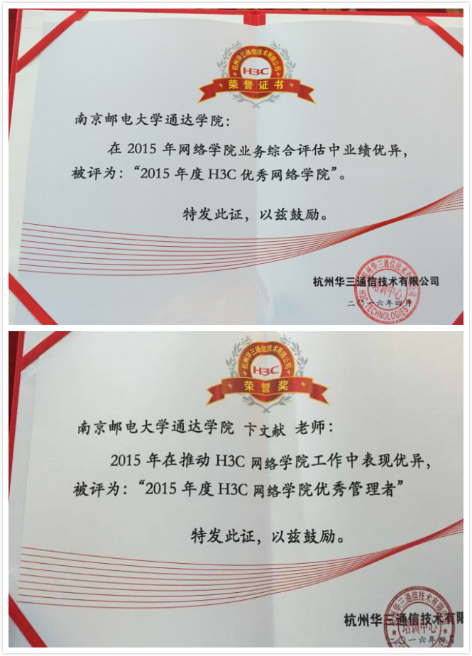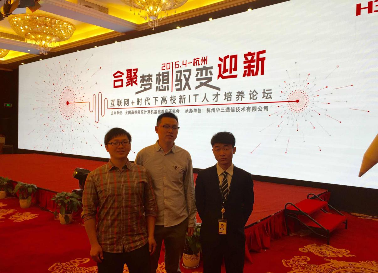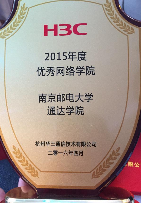 日前,威廉希尔官网姚永明、徐永华老师参加了在杭州召开的由全国高等院校计算机基础教育研究会主办、杭州华三通信技术有限公司承办的“互联网+时代下高校IT人才培养论坛”。会上对2015年度H3C优秀网院进行了表彰。凭借出色的教学质量和学生技能竞赛成绩,威廉希尔官网从500余所H3C网络学院中脱颖而出,获评“2015年度H3C优秀网络学院”。此外,卞文献老师荣获“2015年度H3C网络学院优秀管理者”称号。
