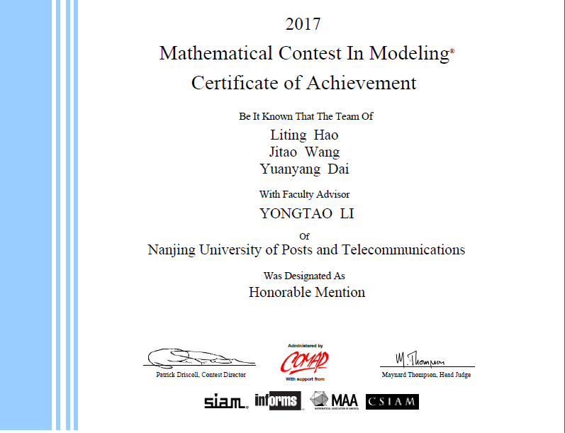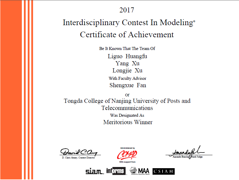 本届美国数学建模竞赛(MCM/ICM)于2017年1月20日至24日在williamhill官方网站(仙林校区)举行。在学院领导和指导老师的关心支持下,同学们顽强拼搏,完成从建立数学模型、求解、验证到论文撰写的全部工作,最终3支队伍斩获佳绩。其中,许杨、徐龙杰、皇甫利国代表队荣获美赛一等奖(Meritorious Winners)(指导老师:范胜雪),高鑫、丁威威、卞希嘉代表队荣获美赛一等奖(Meritorious Winners)(指导老师:闫庆伦),戴元阳、王纪涛代表队荣获美赛二等奖(Honorable Mention)(指导老师:李永涛)。