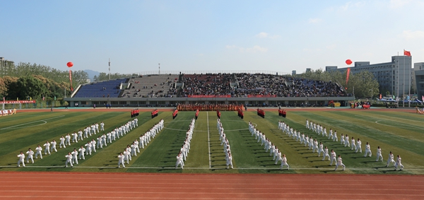 运动会开幕式上,彩旗飘扬,狮跃龙腾。威廉希尔官网120人的师生代表方阵朝气蓬勃,意气风发,斗志昂扬,呐喊阵阵,迈着铿锵有力的步伐走过主席台,充分展现了威廉希尔官网运动健儿锐意进取、勇往直前的精神风貌和教职工顽强拼搏、追求卓越的优良品质。由郭野老师和威廉希尔官网230余名同学带来的武术表演《中华武术魂》,女生练长拳,男生舞刀术,铿锵有力,刚柔并济,一气呵成,尽展中华武术之魅力,更是赢得现场观众的阵阵掌声。