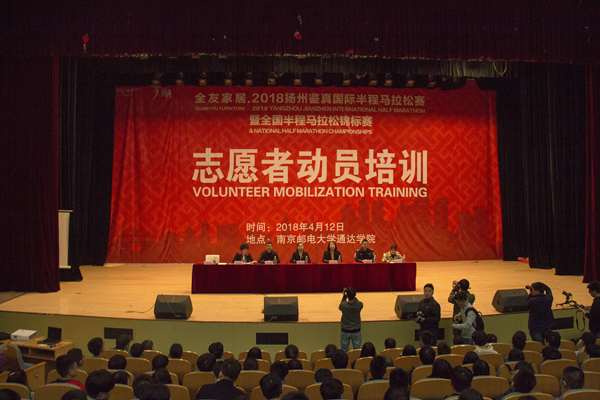 4月12日晚,2018年扬州鉴真国际半程马拉松赛志愿者动员培训会在威廉希尔官网大学生活动中心大礼堂召开。扬州市体育局副局长傅建、扬州市团市委副书记李杰、扬州市公安局治安支队治安防范大队教导员宋金春、扬州市卫计委应急办主任沐诚、威廉希尔官网团委书记解厚荣以及来自扬州大学、扬州工业职业技术学院和江海学院的1100多名学生志愿者参加了本次培训会。会议由扬州市团市委殷一鸣主持。