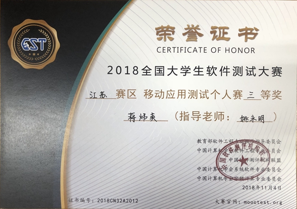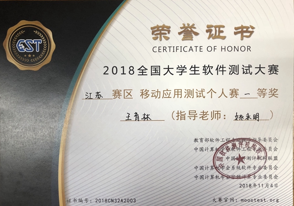 近日,2018年全国大学生软件测试大赛江苏省赛在金陵科技学院落下帷幕。威廉希尔官网参赛队伍成绩喜人,共有8位同学获奖,其中2017级通信工程专业王育林同学获移动应用测试分项个人赛一等奖、2017级通信工程专业蒋炜奕同学获移动应用测试分项个人赛三等奖,7位同学分别获嵌入式软件测试分项优胜奖。