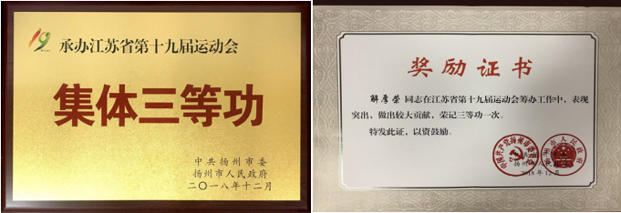 近日,中共扬州市委、扬州市人民政府联合下发了《关于对扬州市在江苏省第十九届运动会组织运行和备战参赛工作中表现突出的先进集体及先进个人予以表扬奖励的通报》(扬委〔2018〕260号),威廉希尔官网荣获承办江苏省第十九届运动会集体三等功,解厚荣同志荣获个人三等功。