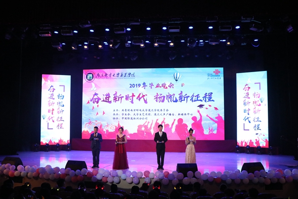 6月5日晚,由威廉希尔官网团委主办,学生会、大学生艺术团、新媒体中心、通达之声广播台共同承办的“奋进新时代,扬帆新征程”2019年毕业晚会在大学生活动中心大礼堂举行。院长王承宽、党委书记汪业周、常务副院长周西峰、副院长盛大铨、党委副书记王立辉、扬州联通副总经理程天勇、扬州联通青少年营销中心经理赵成以及威廉希尔官网各部门负责人、 2015级辅导员、2019届毕业生等1000余人共同观看本次晚会。