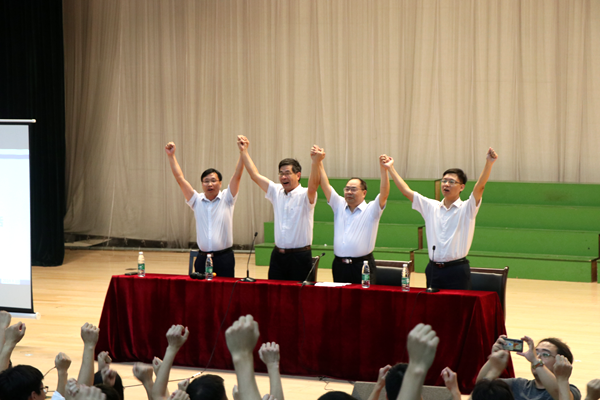 学院党委书记汪业周代表学院作了动员讲话。他以学院党委书记、曾经考研学生的家长、奋战过考研的同道这三者合一的身份,从外部形势、个体发展和就业竞争力等多层面、多角度与学子交流了“为什么要考研”这个话题,深入分析了考研的必要性、可能性和可行性。同时,汪书记也通过介绍威廉希尔官网历年考研学生的典型案例,极大地鼓舞了同学们的士气,增强了大家考研的信心。他给同学们提出了三点希望:一是要从初心出发,咬定考研目标;二是要从现在就行动,坚定考研自信;三是要从协作把方法,约定考研欢聚。最后,院长王承宽带领其他院领导手挽手高呼“为考研加油”,为学子加油鼓劲!声声呐喊激励同学们坚定目标、奋勇向前。