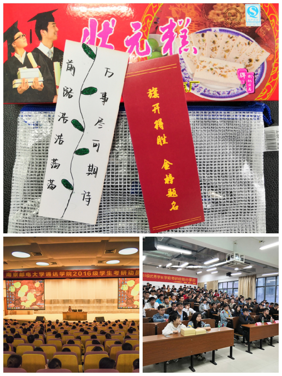 学院领导为考研学子送状元糕、考试文具袋、老师和学弟学妹亲手书写的加油书签,并关切询问同学们的备考情况,为他们加油鼓劲。此外,学工处还给考研学生送上了减压玩具,开展了心理减压咨询活动。