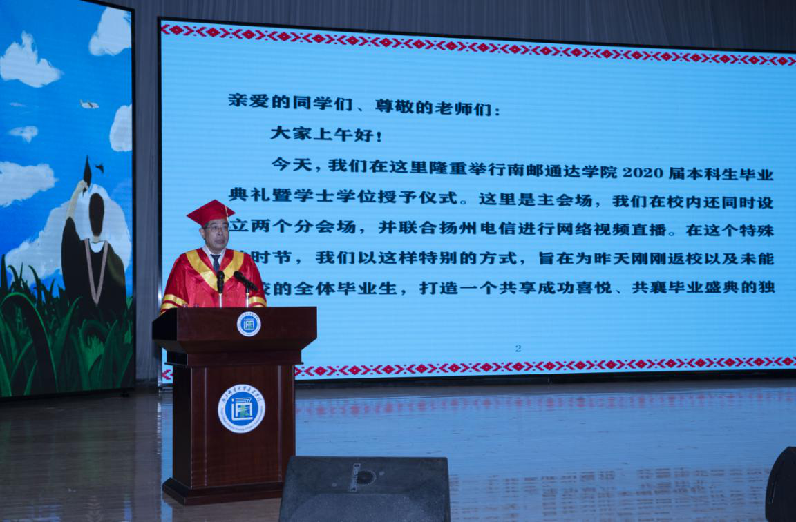 王承宽院长在致辞中代表学院,向全体毕业生致以最热烈的祝贺!向辛勤养育和悉心教导你们的父母、师长表示最崇高的敬意!他分别以院长、老师、长者三种角色,为学生历经四年学习,练就了赢得未来的本领而喝彩;为学生历经疫情磨砺,增添了战胜困难的力量而点赞;为学生历经岁月磨砺,领悟了通天达地的真谛而祝福!临别之际,他用三句话作为临别赠言送给2020届全体毕业生,第一句是春华秋实,历经蜕变方能感受成长;第二句是纵观历史,迎难而上方能成就强大;第三句是初心如磐,注重修为方能登高望远。他祝福和期盼2020届全体毕业生要注重热爱、敬畏、坚韧这三种修为,切实践行“努力在危机中育新机、于变局中开新局”的战略论断,切实抓住职业黄金期与民族伟大复兴期叠加的难得机遇,以破茧而出的本领、灾难磨砺的力量、飞龙在天的豪迈,一飞冲天、一路通达、一生幸福!