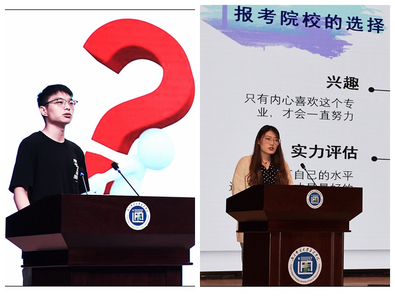 学院常务副院长赵洪牛老师、南邮外国语学院副院长臧庆老师两位考研名师分别针对考研数学和英语复习给同学们提出了详细的建议。赵洪牛老师分析了考研各阶段的主要学习任务,强调了数学复习不仅要看书、做题,更重要的是要学会思考、善于分析归纳,做到融会贯通;臧庆老师用诙谐幽默的语言讲解了考研英语试卷设计及应对策略。成功考取桂林电子科技大学的周超和中国计量大学的陈彦伶两名2016级学生分享了在选择报考院校、全力复习备战、把握备考节奏、克服心理压力等环节中的经验与心得,鼓励学弟学妹们要坚定信心,持之以恒。
