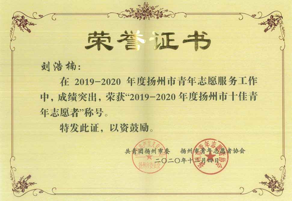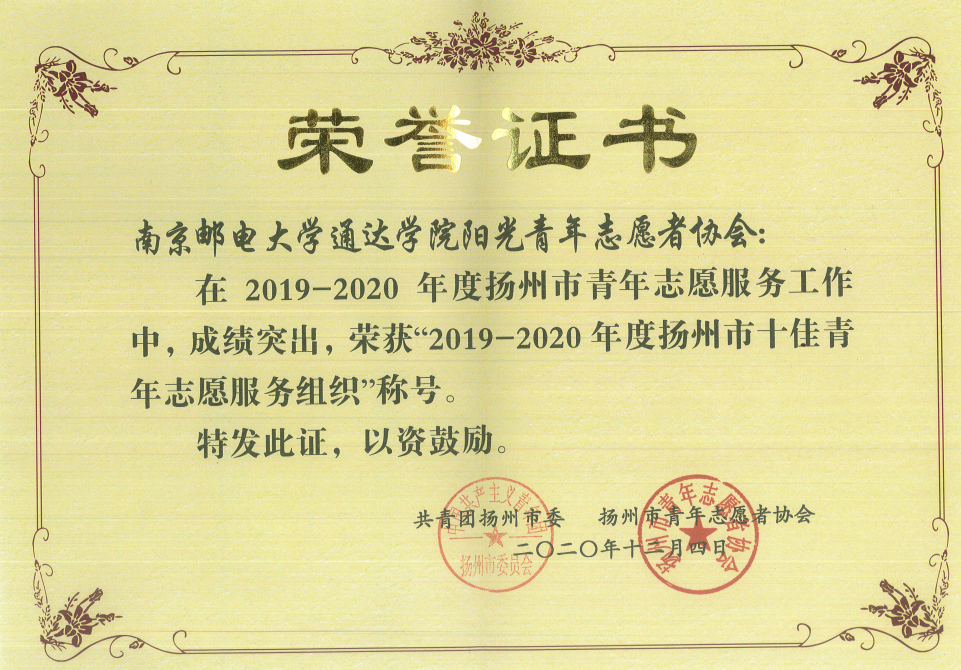 近日,共青团扬州市委、扬州市青年志愿者协会联合下发了《关于表彰2019—2020年度扬州市优秀青年志愿者、志愿服务组织、志愿服务项目的决定》(团扬委联〔2020〕31号),威廉希尔官网阳光青年志愿者协会会长刘浩楠荣获“扬州市十佳青年志愿者”称号,威廉希尔官网阳光青年志愿者协会荣获“扬州市十佳青年志愿服务组织”称号。