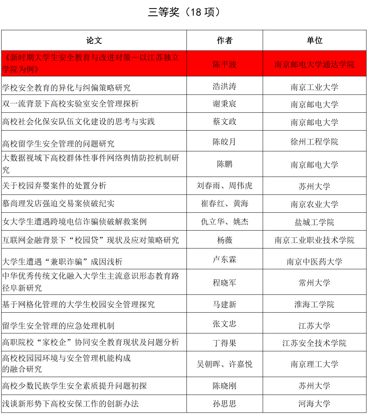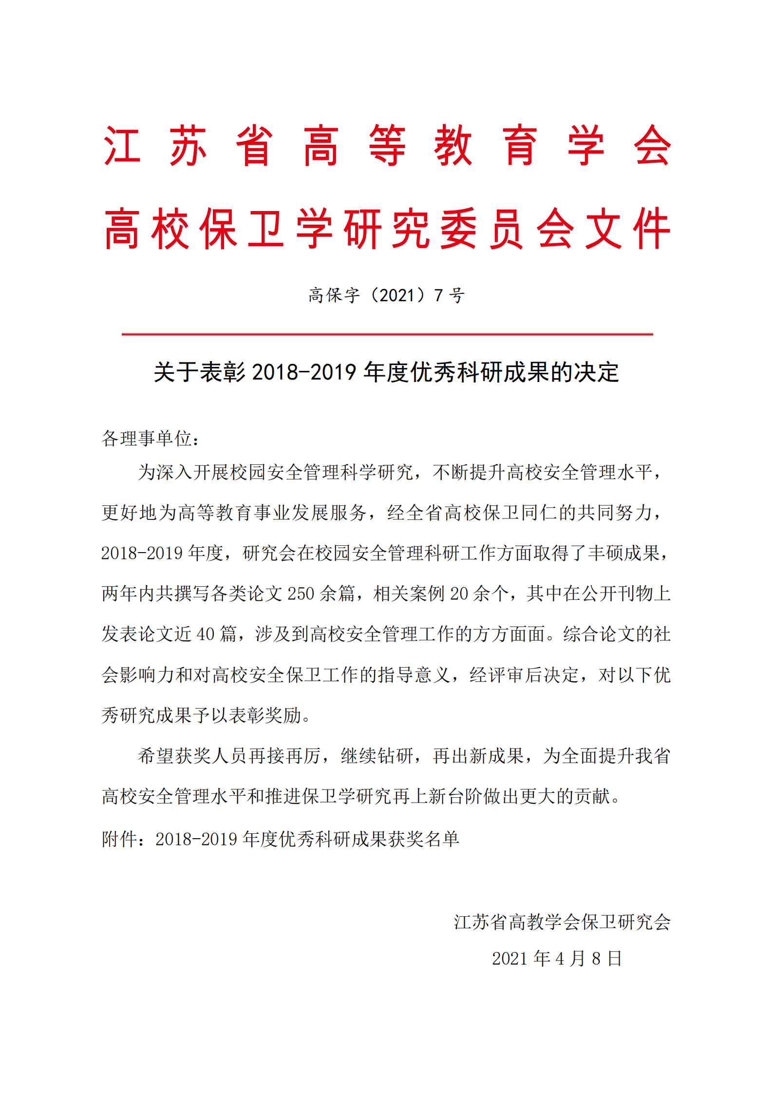 近日,江苏省高等教育学会高校保卫学研究委员会发文《关于表彰2018-2019年度优秀科研成果的决定》(高保字[2021]7号),威廉希尔官网保卫处陈平波同志发表的《新时期大学生安全教育与改进对策—以江苏独立学院为例》论文荣获科研成果三等奖 。