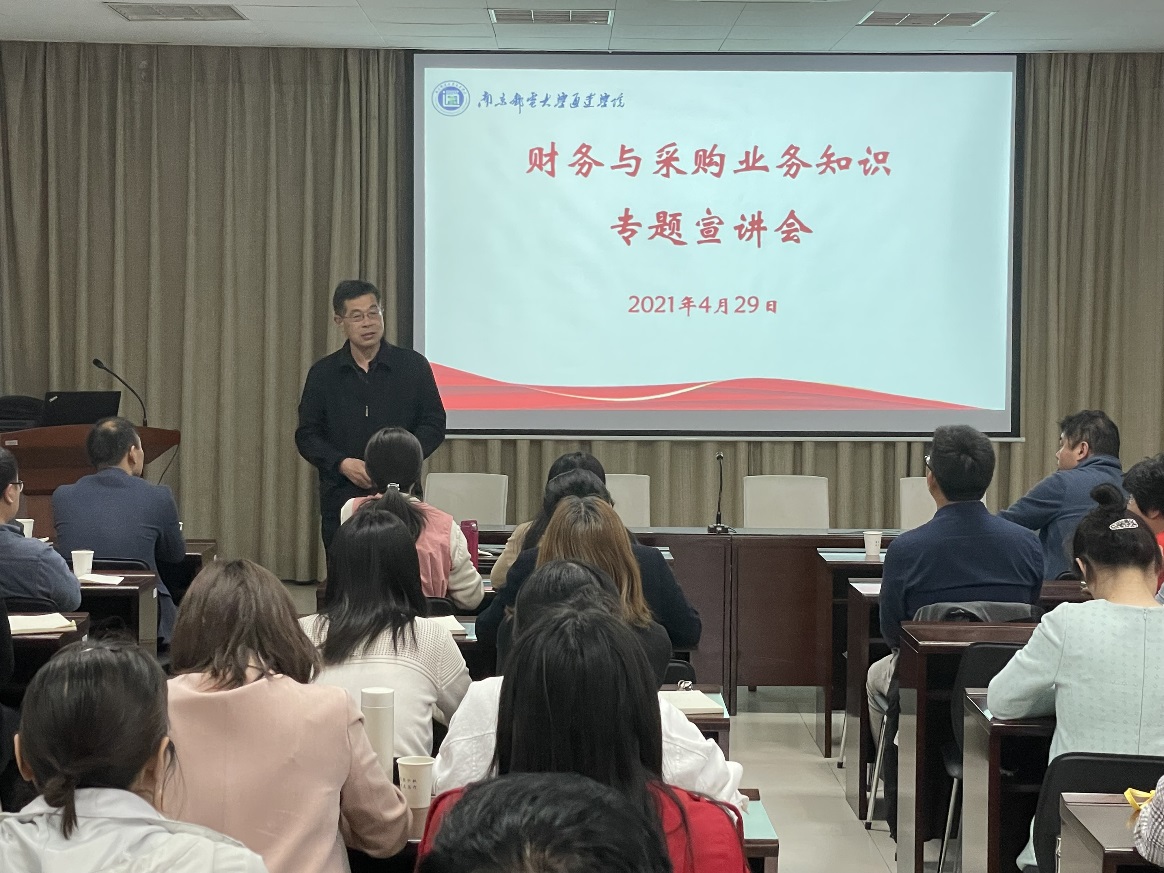 4月29日下午,威廉希尔官网特邀williamhill官方网站纪委委员、财务处处长张进,williamhill官方网站采购招标管理办公室主任胡学忠,在大学生活动中心一楼报告厅召开财务与采购业务知识专题宣讲会。院长王承宽、副院长倪可,各部门主要负责人及相关部门人员参加会议。会议由院长王承宽主持。