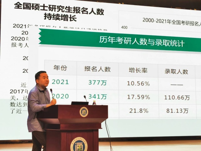 王霁主任宣讲分为三部分:一是介绍了全国考研总体形势,考研人数不断上升,优质高校考研竞争日益增大。二是介绍了williamhill官方网站的考研招录情况,近三年报考人数和录取分数线大幅增加,考取难度增大。今年,威廉希尔官网有49名同学被南邮录取,最高分426分。三是介绍了williamhill官方网站2022年招生情况,详细分析了报考流程、专业设置、考试科目、录取分数以及学硕和专硕的区别等。