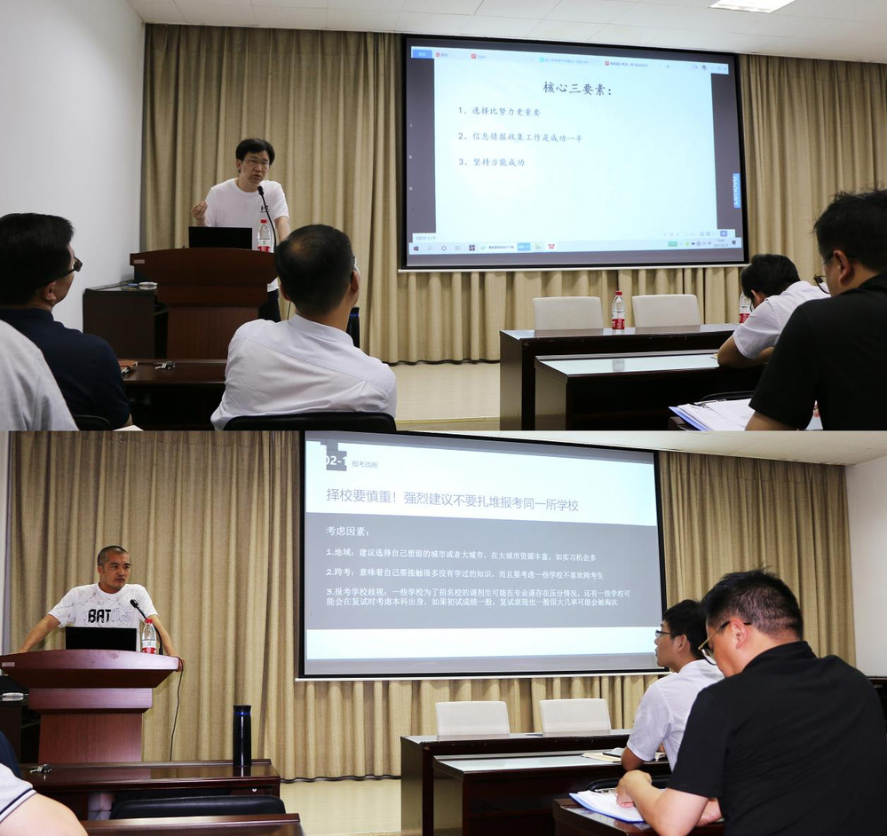 会上,教务处处长志锋首先介绍了学院考研导师的相关政策,解读了考研导师的选拔条件、工作职责,明确了相关工作要求随后,由往届考研导师唐军和苗东林分别分享了自己的指导学生经验。唐军老师重点介绍了考研目标院校的选择、专业定位,以及如何分配好时间做好考研准备等。苗东林老师则从“考研是什么”“为什么考研”及“怎么考研作了分享。