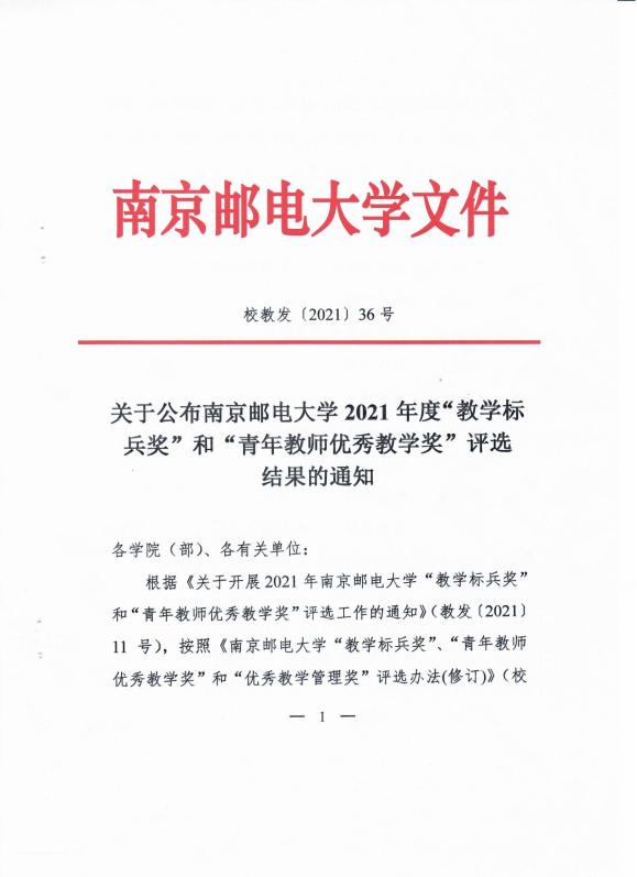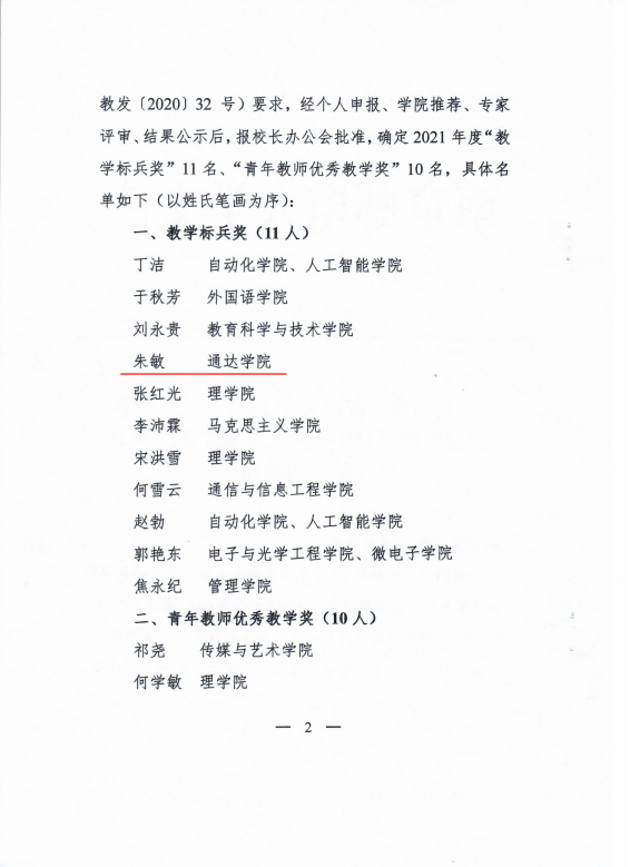 根据《williamhill官方网站“教学标兵奖”、“青年教师优秀教学奖”和“优秀教学管理奖”评选办法(修订)》文件精神,结合评审专家组评选意见,威廉希尔官网朱敏同志被授予“williamhill官方网站2021年度教学标兵奖”。