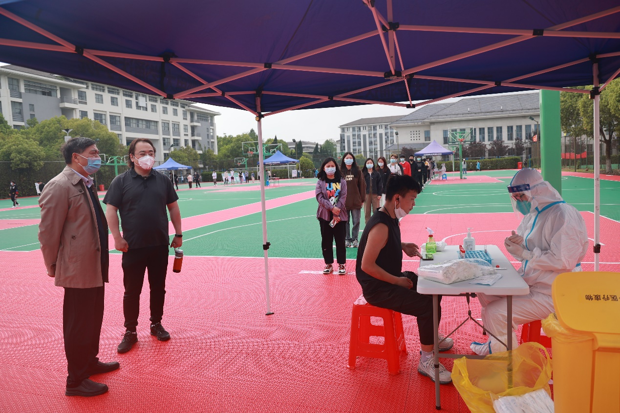 上午,院长王国平、党委书记朱清等院领导先后来到篮球场、教学楼、体育馆等临时采样点走访了解检测情况。在体育馆采样点,院长王国平、党委书记朱清与等候检测的师生进行交流,叮嘱大家要认真遵循防疫要求,提高自我防护意识,同时叮嘱相关部门要继续做好服务保障工作。