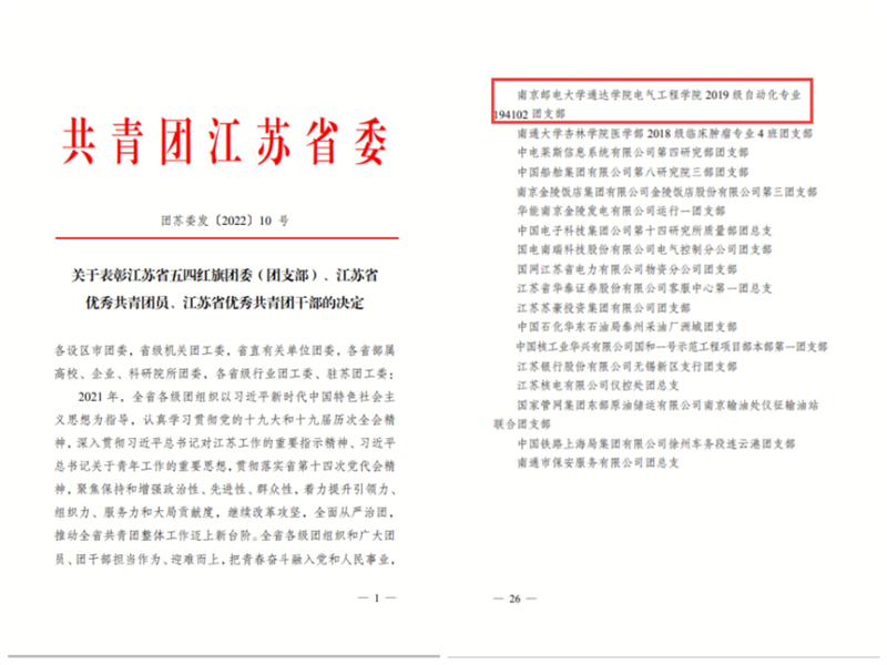 近日,共青团江苏省委下发《关于表彰江苏省五四红旗团委(团支部)、江苏省优秀共青团员、江苏省优秀共青团干部的决定》,威廉希尔官网194102团支部荣获“江苏省五四红旗团支部”称号,这也是威廉希尔官网团支部首次获得该殊荣。“江苏省五四红旗团支部”是共青团江苏省委授予基层团组织的最高荣誉,本年度全省共有5个独立学院团支部获评此奖项。