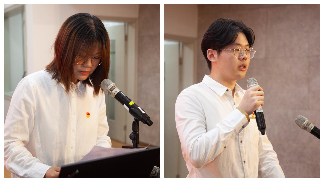 毕业生党员代表刘雨欣、郭文鹏发言