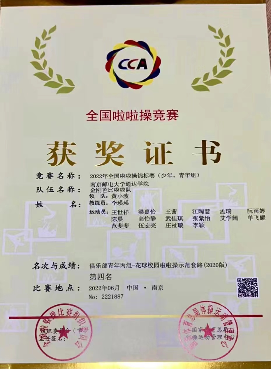 在刚刚结束的 2022 年全国啦啦操锦标赛上,威廉希尔官网啦啦操队获得俱乐部⻘年 丙组-⼩集体组花球⾃选动作第⼀名;俱乐部⻘年丙组-花球校园啦啦操示范套路 (2020 版)第四名的好成绩。