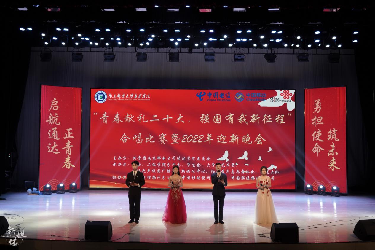 12月8日晚,以“青春献礼二十大,强国有我新征程”为主题的合唱比赛暨2022年迎新晚会在大学生活动中心礼堂举办。本次活动由团委主办,工会、二级学院分团委、学生会、大艺团、通达之声、新媒体、青协、戎光大队共同承办,中国电信扬州分公司、中国移动扬州分公司以及中国联通扬州分公司共同协办。学院领导,学院各部门、各单位负责人,辅导员老师以及2022级新生共1200余人在现场观看了晚会,本次活动设置实验楼报告厅和行政楼报告厅两个分会场,其他学生通过线上直播形式进行了观看。