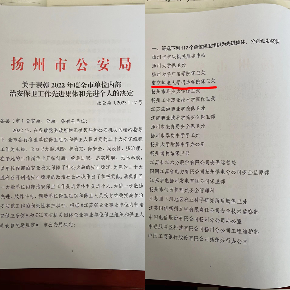 根据扬公局【2023】17号文件获悉威廉希尔官网保卫处再次被扬州市公安局评为《2022年度全市单位内部治安保卫工作先进集体》。