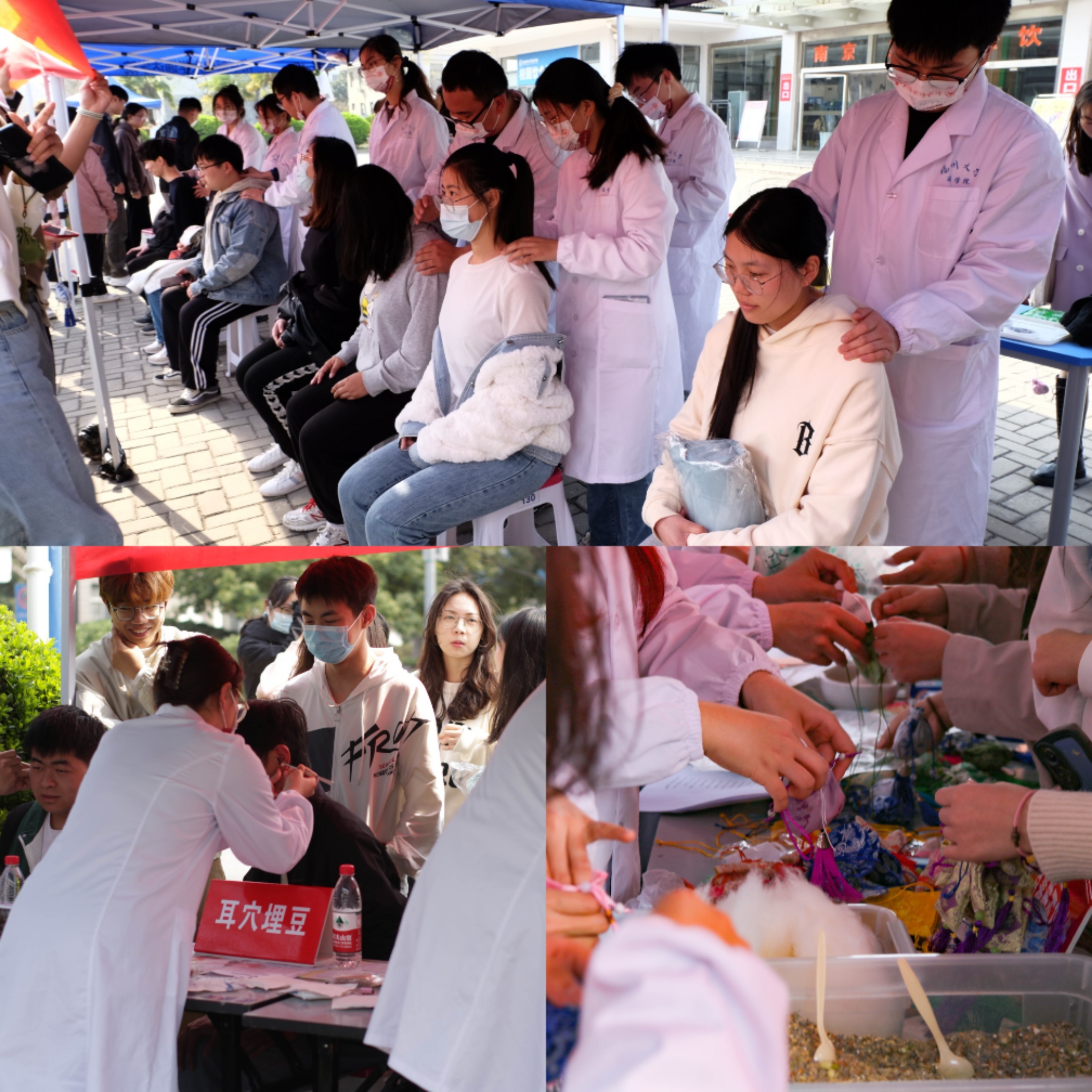 活动中,扬大医学院的学生们利用所学专业知识,通过按摩肌肉帮助威廉希尔官网师生们舒缓疲劳、放松解压;通过耳穴埋豆,用胶布把药豆固定在耳朵相应的穴位上反复按揉,帮助体验者改善睡眠质量。在工作人员的指导下,参与活动的师生还亲手制作了养心安神的中药香囊。精心的活动设计、贴心的助眠小礼品吸引了近千名师生驻足观看、积极参与。