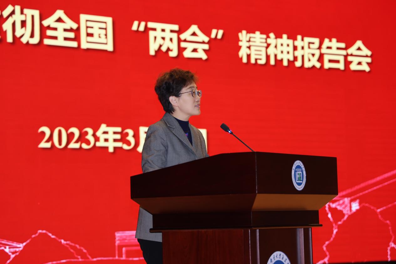 叶美兰校长以《踏上新征程,奋楫再出发》为题,从十四届全国人大一次会议概况,习近平总书记在大会期间的重要讲话精神,全国人大常委会、‘一府两院’工作报告,江苏代表团活动和审议情况等七个方面传达了全国两会精神。与大家分享了会议盛况和她参会的感悟与收获,带领大家站在新起点,回望波澜壮阔的新时代中华民族伟大复兴历史进程;带领大家把握新目标,眺望恢宏浩荡的充满光荣和梦想的新征程;带领大家着眼新实践,学习习近平总书记在全国两会上的重要讲话精神,领会全国两会关于牢牢把握高质量发展这个首要任务的部署。叶校长的报告视野宏阔、内容全面、重点突出、条理清晰,充满激情、催人奋进,具有很强的思想性、理论性和针对性,是一堂深入学习贯彻习近平总书记重要讲话和全国两会精神的生动辅导课。最后,她用“为者常成,行者常至,历史不会辜负实干者”勉励全体师生在新征程上奋楫扬帆再出发,为中国式现代化贡献南邮通达力量。