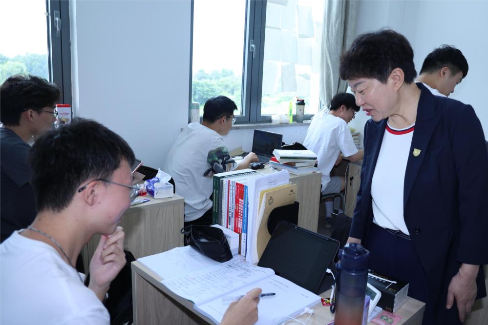 在校期间,校领导心系暑期留校考研学生的学习和生活情况。在双创中心,叶美兰校长等在学院领导的陪同下走进考研教室,关切询问同学们拟攻读学校、复习进程、遇到的困难等学习与生活方面的相关情况,对同学们在酷暑中留校复习的精神表示赞许,勉励同学们珍惜时光、劳逸结合、努力学习。叶校长还现场为留校的学生们发放了降暑饮料等慰问品,送来了夏日清凉和殷殷鼓励。
