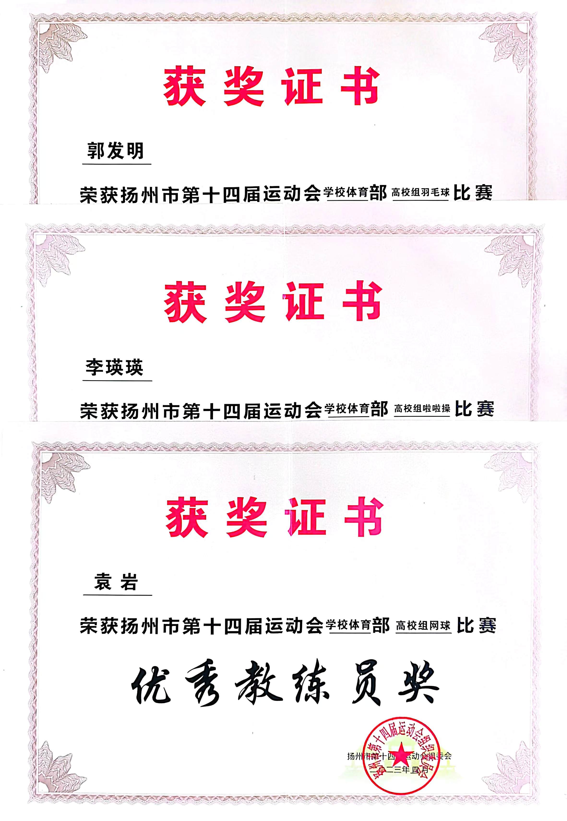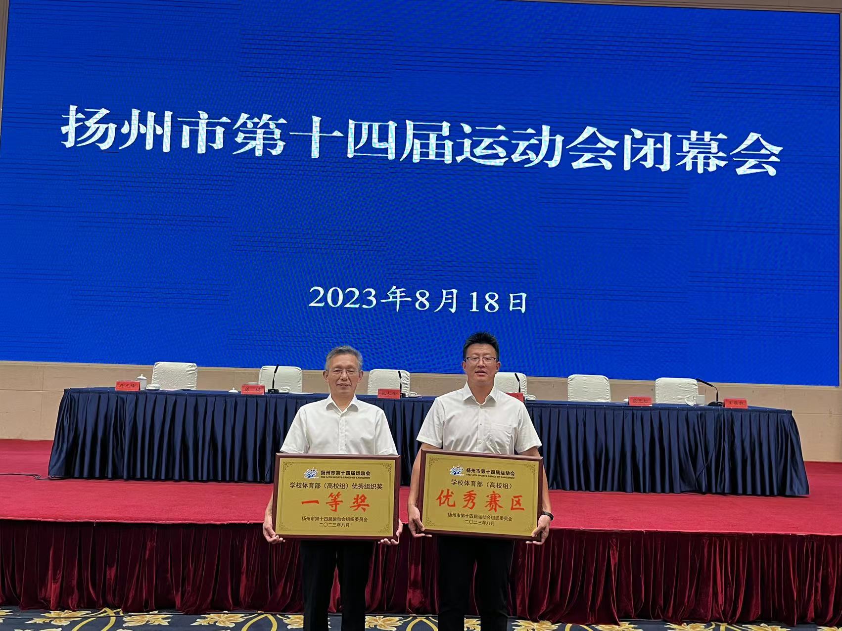2023年8月18日下午,扬州市第十四届运动会闭幕式暨表彰大会在市会议中心举行,威廉希尔官网代表团荣获高校部团体总分第一名,金牌榜第二名的佳绩,并获“优秀组织奖一等奖”、“优秀赛区奖”称号。威廉希尔官网袁岩、李瑛瑛、郭发明三位教师荣获优秀教练员称号。