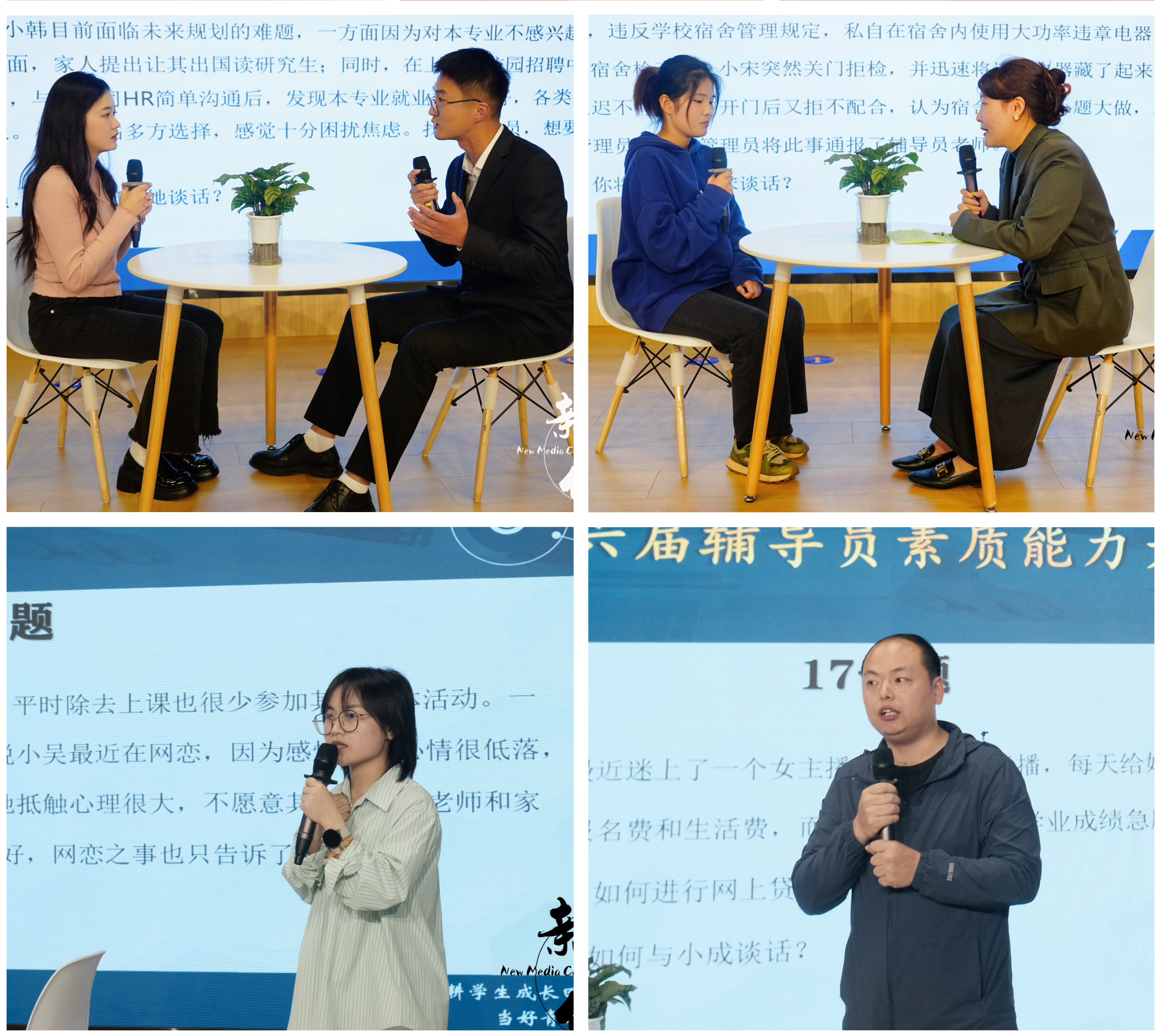 26名参赛辅导员通过抽签与助演学生临时组队,通过情景再现的方式针对“学生宿舍矛盾”“慢就业懒就业”“校园贷网络贷”“网络舆情应对与处置”等学生日常管理事务中多发的热点问题开展谈心谈话。副院长倪可、纪委书记张建波、党委副书记兼副院长王楷根据参赛选手的表现进行了针对性提问,选手们就评委提出的问题给予现场作答。