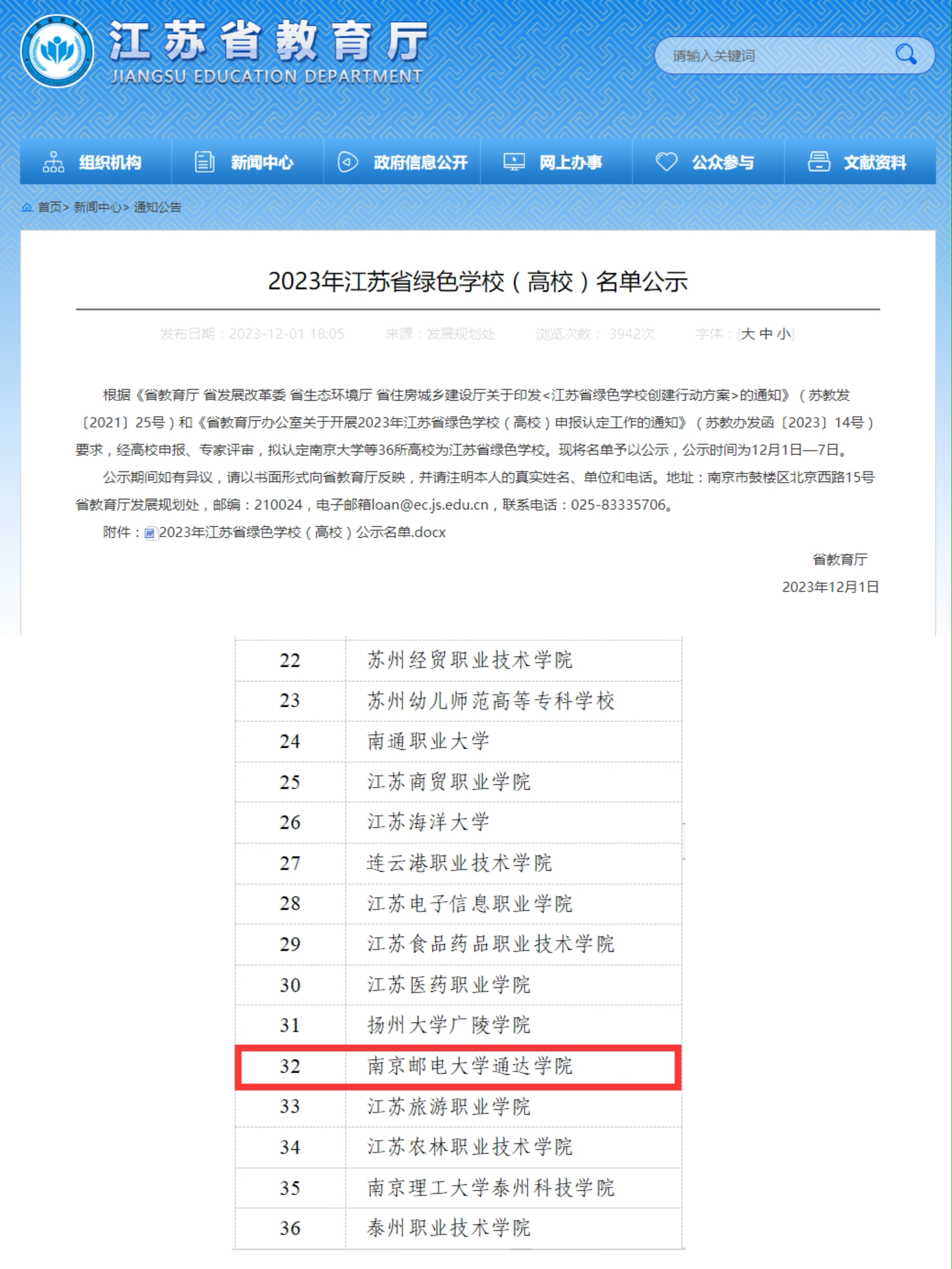 近日,江苏省教育厅发布了2023年江苏省绿色学校(高校)公示名单,威廉希尔官网获评“江苏省绿色学校(高校)”。