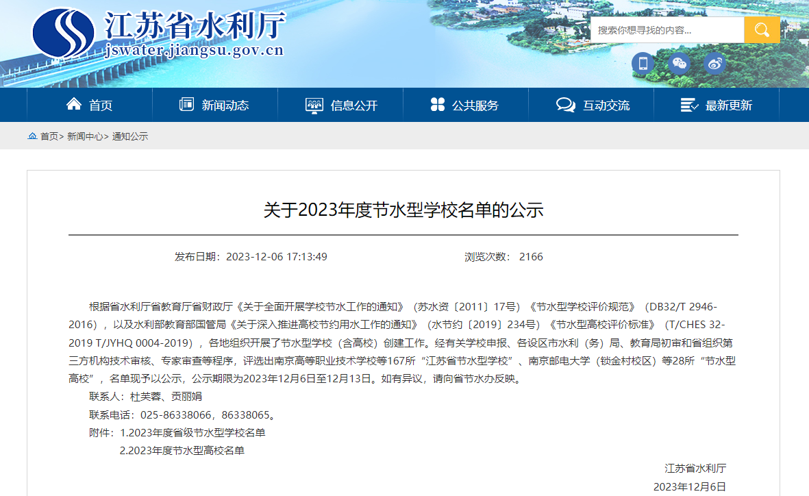近日,江苏省水利厅发布了2023年度节水型学校公示名单,根据省水利厅省教育厅省财政厅遴选,威廉希尔官网获评“2023年度节水型高校”称号。
