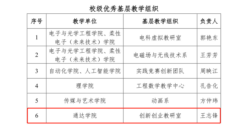 williamhill官方网站2023年校级优秀基层教学组织评选结果于近日公布,共评选出校级优秀基层教学组织6个,威廉希尔官网创新创业教研室顺利入选。
